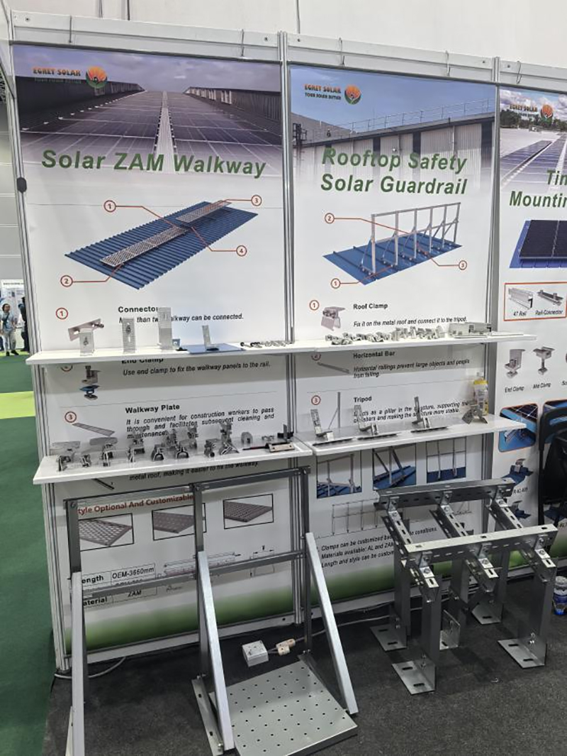 Multi clientes in hac exhibitione carports ferri solaris favebant. uterqueuno latere et duplex carportsin promptu erant. Singula autocineta carpora in privatis passibus institui possunt et ad stationes novas vehiculis energiae industriae applicandas conexi sunt. Duplex carporta in postesque institui possunt in foro shopping amet raedam, dum plus statio raedam ac stationes educunt. Comparari ad conventionales carports ferro iactato, carports solares meliorem offerunt insulationem, reducendo incommodum pedestrium conscendit et vitam componentium plasticorum extendens ut windshield wipers. Electricitas generata in craticula vendi potest vel in usum privatum adhibita, solutionem mutuam salutarem creans. Unitas pretium carporti solaris watt iugis ab $0.08/W ad $0.13/W. Contractus signati cum pluribus clientibus in-site pro emptionibus in plena repositoria.